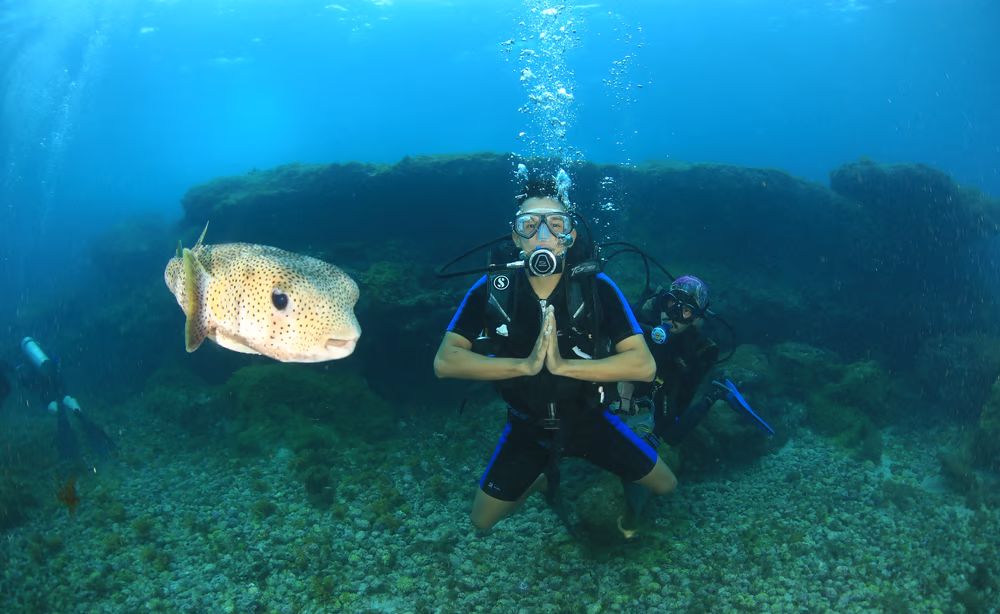 1° - No trajeto do porto até o ponto de mergulho, os instrutores irão te dar uma breve aula. 2° - Você será equipado com o auxílio dos instrutores. 3° - Prática de exercícios básicos na superfície da água com seu instrutor e início do mergulho assim que você se sentir confortável. 4° - Mergulho de até 12m com aproximadamente 35 minutos de duração.